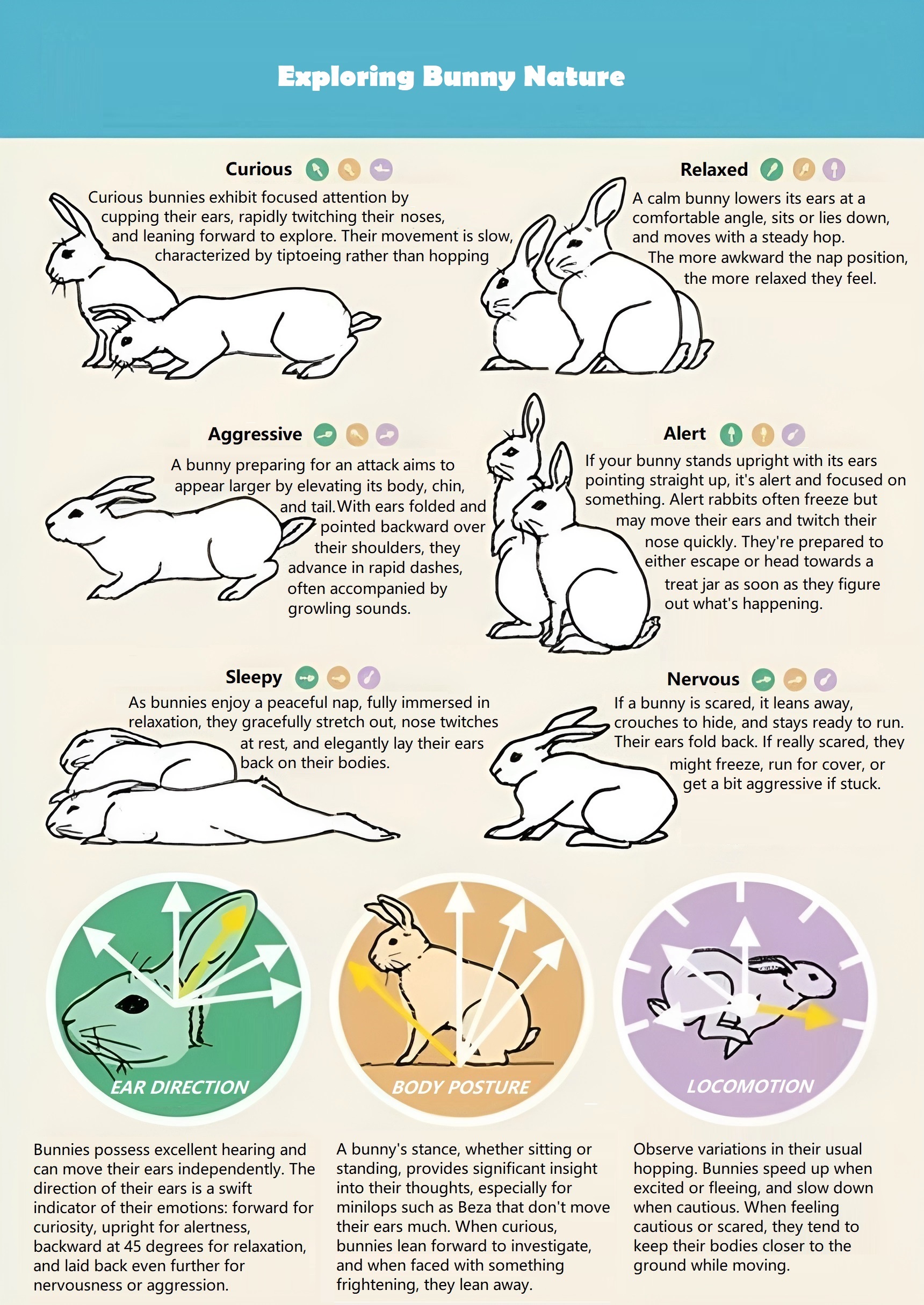 Curious bunnies exhibit focused attention by cupping their ears, rapidly twitching their noses, and leaning forward to explore. Their movement is slow, characterized by tiptoeing rather than hopping.